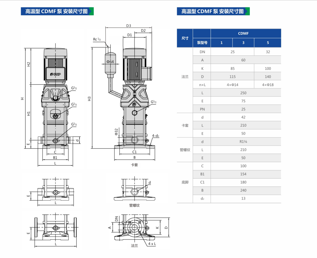 本產品在CDMF輕型立式多級離心泵的結構基礎上,增加了冷卻裝置,適用于最高溫度為+180℃的液體。液體流經冷卻裝置到達機封腔處可冷卻至+120℃或更低,有效保證機械密封的安全工作溫度,同時避免高溫對電機的損害影響。產品擁有CDMF的超高性能,MEI≥0.7。同時采用IE3超高效電機,使產品更加高效節(jié)能,綠色環(huán)保。