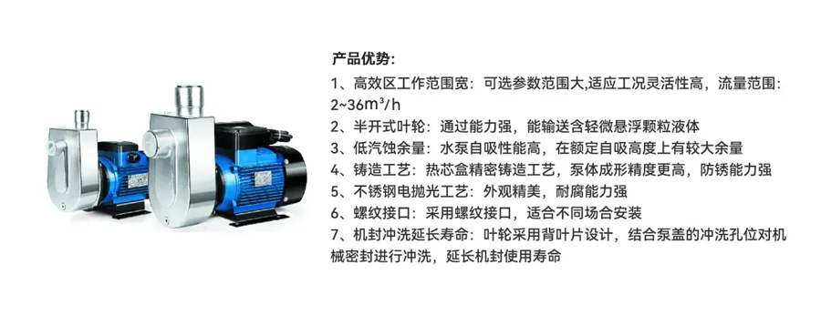 NZXF系列小型不銹鋼自吸泵是在硏究國內外同類產品的基礎上,結合我司先進優(yōu)秀的水力模型開發(fā)的一種結構新穎、性能卓越的產品。該泵與目前市面同類產品相比具有自吸性能好,有一定排污能力,結構簡單緊湊,外觀小巧精美,特殊結構能保證機械密封的可靠性和延長其運行壽命,各項性能指標在國家實驗室測試合格,在國內處于領先狀態(tài),在家用、工農 業(yè)具有廣泛前景。